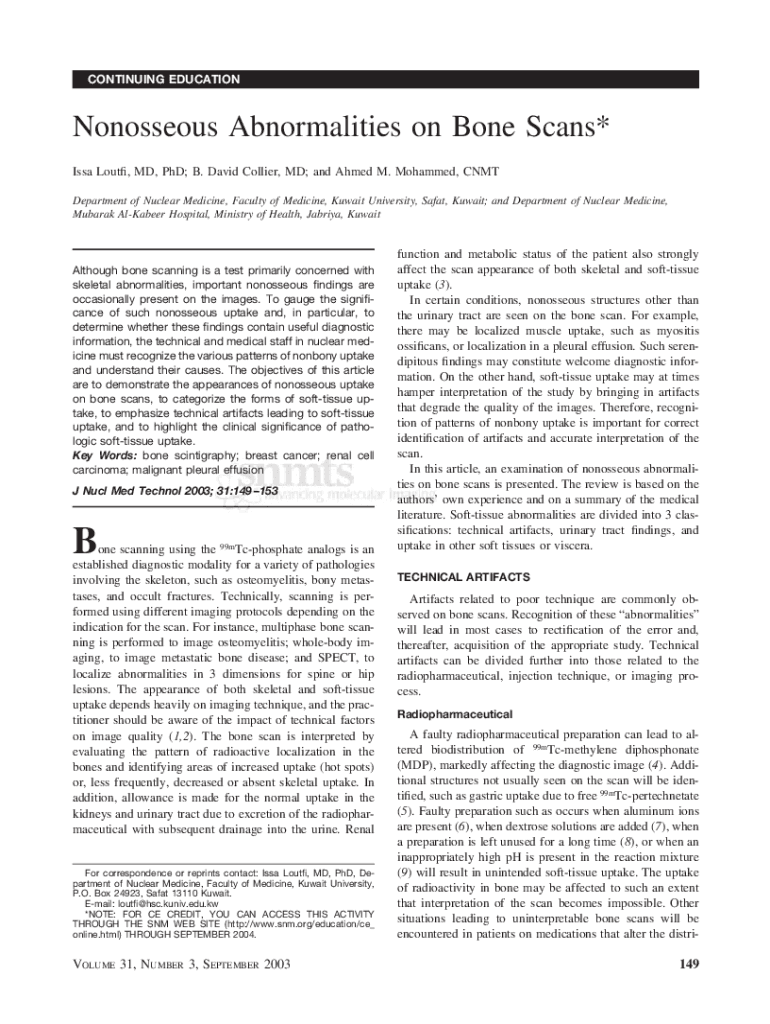 CONTINUING EDUCATIONNonosseous Abnormalities on Bone Scans* SSA Outfit, MD, PhD; B. David Collier, MD; and Ahmed M. Mohammed, CNET Department of Nuclear Medicine, Faculty of Medicine, Kuwait University,