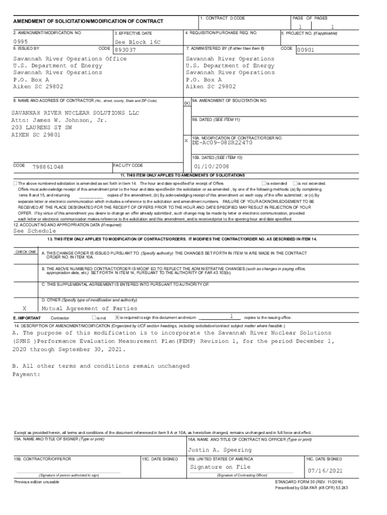 2. AMENDMENT/MODIFICATION NO.3. EFFECTIVE DATEI4. REQUISITION/PURCHASE REQ. NO.0995See Block 16C 893037 Savannah River Operations Office U.S. Department of Energy Savannah River Operations P.O. Box
