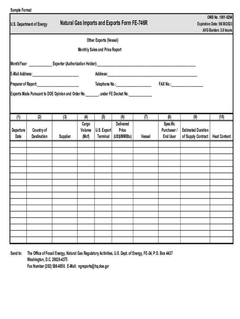 Sample Format U.S. Department of Energy OMB No. 19010294 Expiration Date: 09/30/2023 AVG Burden: 3.0 hoursNatural Gas Imports and Exports Form FE746R Other Exports (Vessel) Monthly Sales and Price