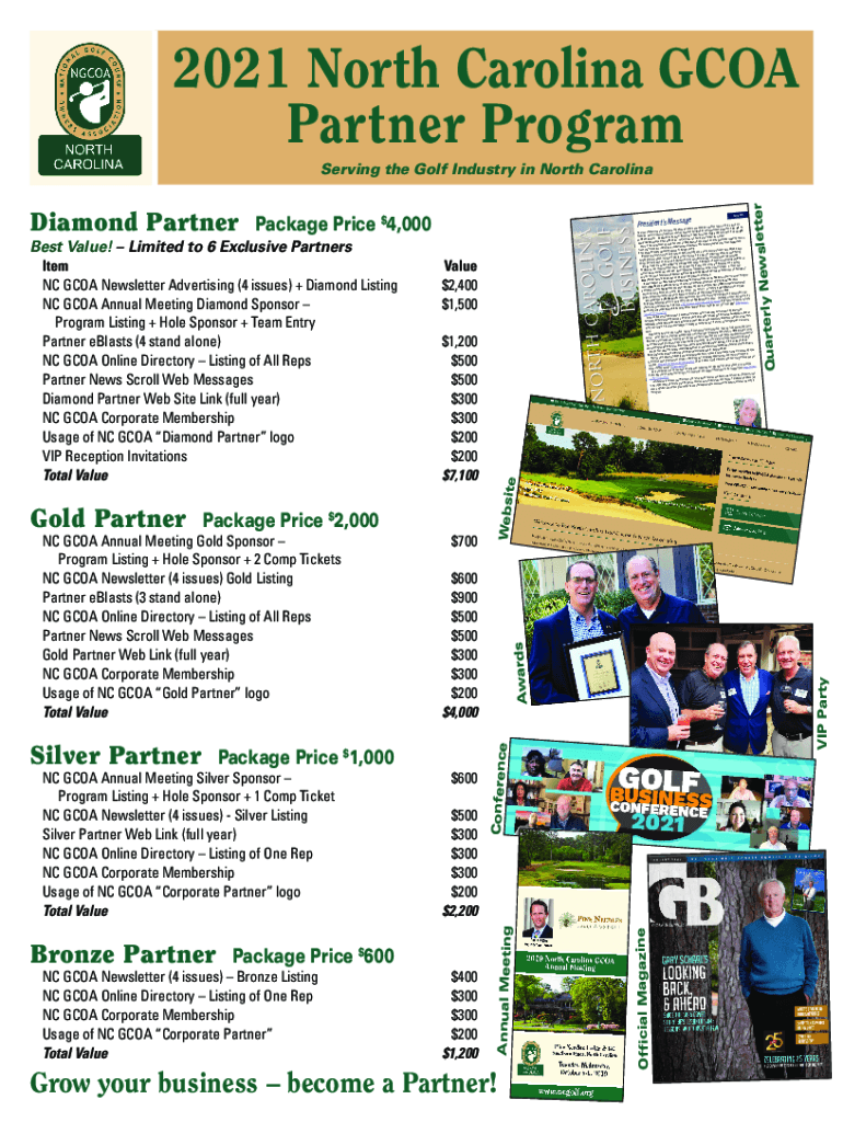 2021 North Carolina GOA Partner Program Best Value! Limited to 6 Exclusive PartnersItemValueNC GOA Newsletter Advertising (4 issues) + Diamond Listing$2,400 NC GOA Annual Meeting Diamond Sponsor $1,500