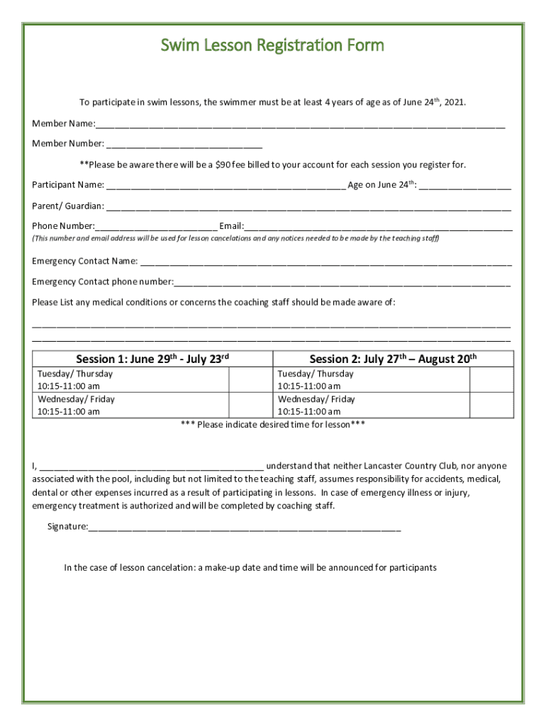Swim Lesson Registration Form To participate in swim lessons, the swimmer must be at least 4 years of age as of June 24th, 2021. Member Name:___ Member Number: ___ **Please be aware there will be