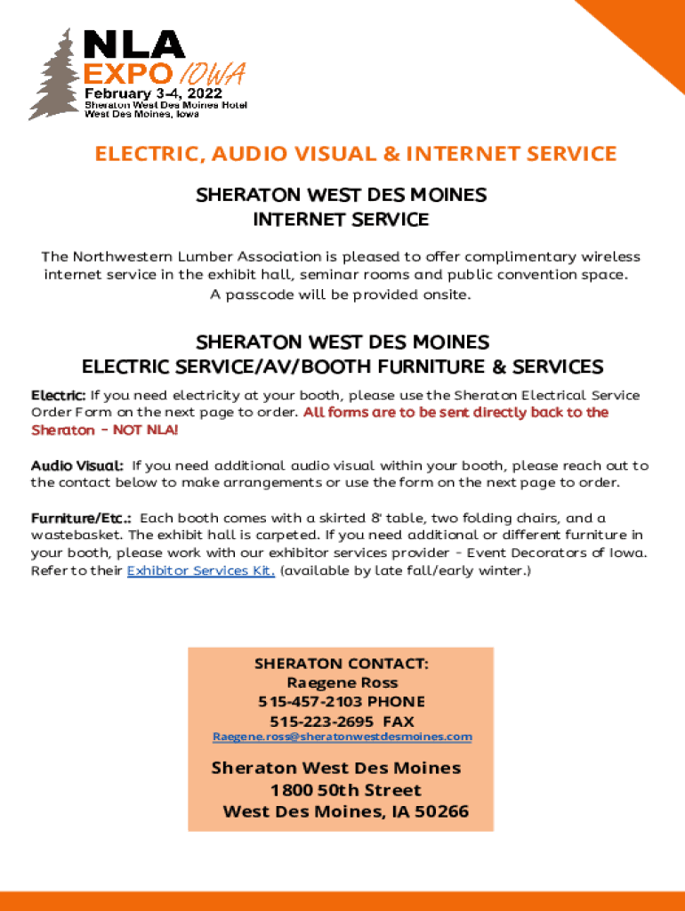 ELECTRIC, AUDIO VISUAL & INTERNET SERVICE SHERATON WEST DES MOINES INTERNET SERVICE The Northwestern Lumber Association is pleased to offer complimentary wireless internet service in the exhibit hall,