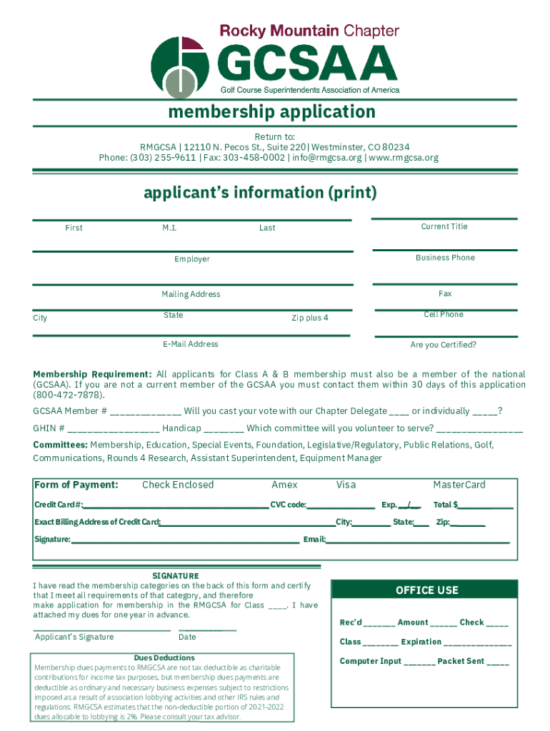 Membership application Return to: FMCSA | 12110 N. Pecos St., Suite 220| Westminster, CO 80234 Phone: (303) 2559611 | Fax: 3034580002 | info@rmgcsa.org | www.rmgcsa.orgapplicants information (print)