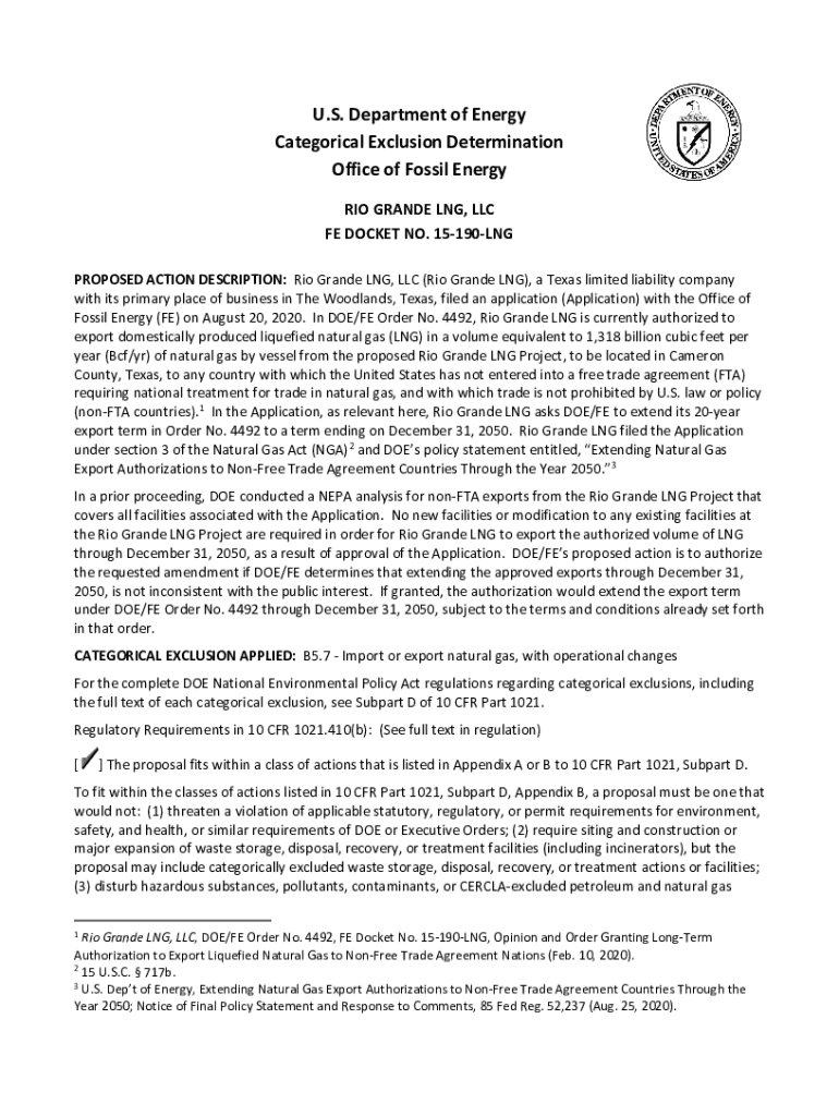 U.S. Department of Energy Categorical Exclusion Determination Office of Fossil Energy RIO GRANDE LNG, LLC FE DOCKET NO. 15190LNG PROPOSED ACTION DESCRIPTION: Rio Grande LNG, LLC (Rio Grande LNG),