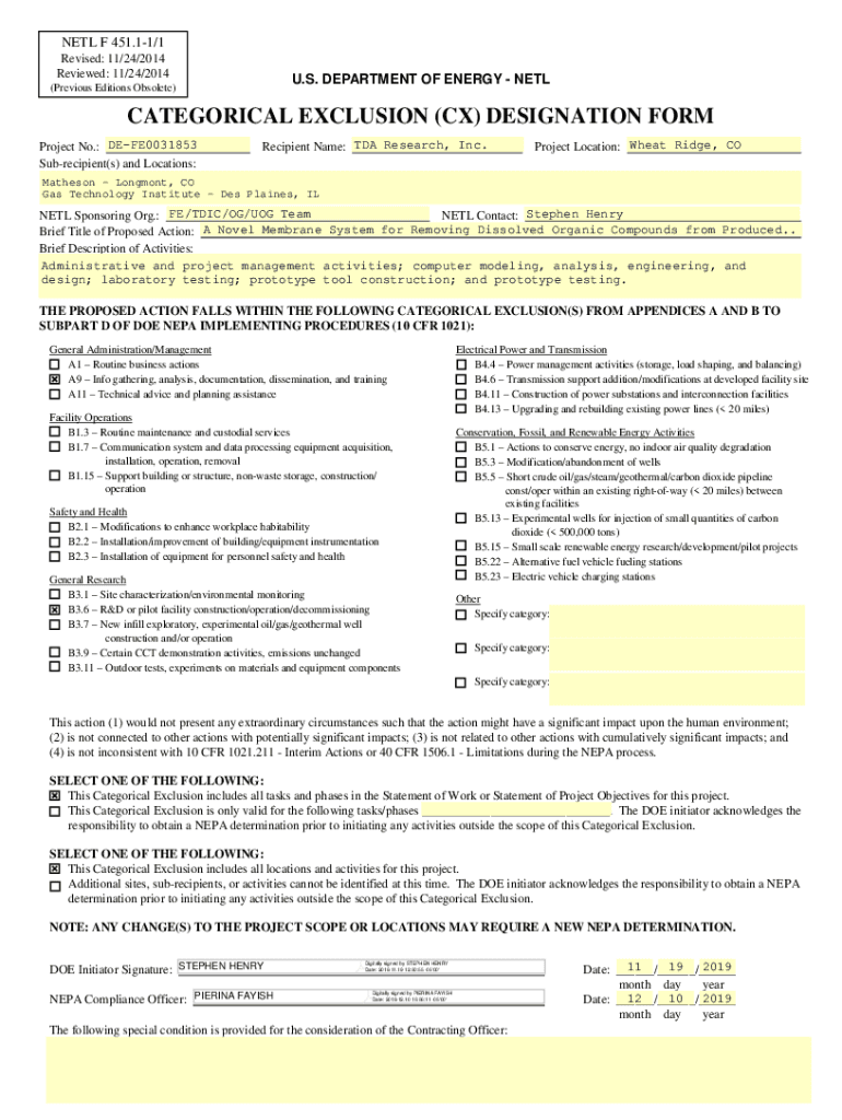 NET F 451.11/1 Revised: 11/24/2014 Reviewed: 11/24/2014U. S. DEPARTMENT OF ENERGY NET(Previous Editions Obsolete)CATEGORICAL EXCLUSION (CX) DESIGNATION FORM Project No.: DEFE0031853 Subrecipient(s)