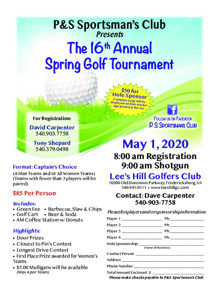 P&S Sportsman Club Presents 16th Annual Spring Golf Tournament $50 for Hole SponsorCompany Lo go will be displayed on hole marker sign posted at the tenor Registration:David Carpenter 540.903.7758