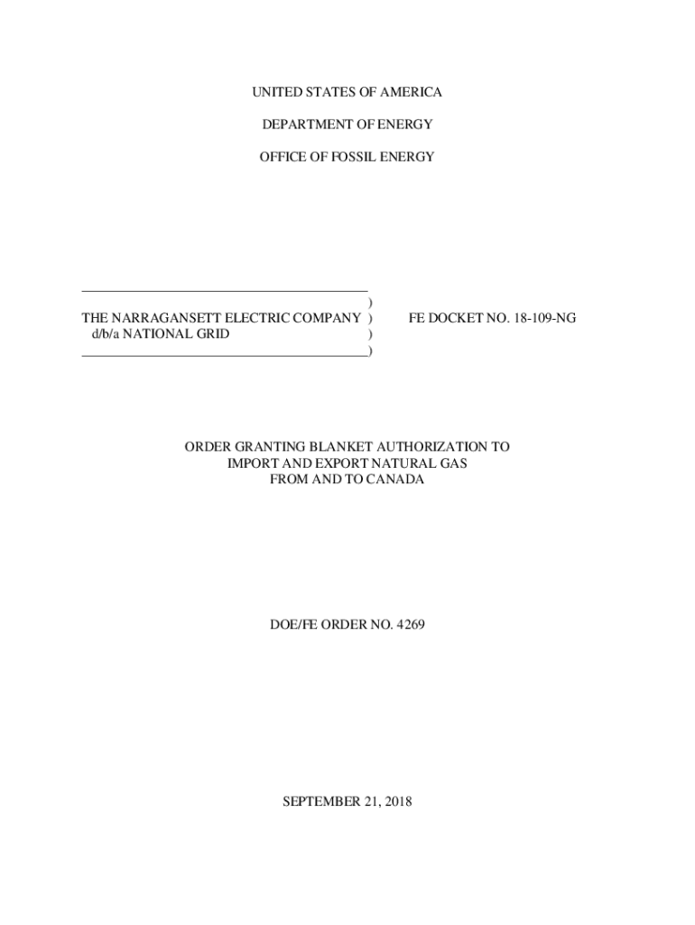 UNITED STATES OF AMERICA DEPARTMENT OF ENERGY OFFICE OF FOSSIL ENERGY___) THE NARRAGANSETT ELECTRIC COMPANY) d/b/a NATIONAL GRID) ___)FE DOCKET NO. 18109NGORDER GRANTING BLANKET AUTHORIZATION TO IMPORT
