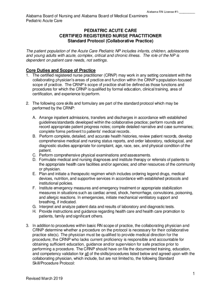 Alabama RN License #1___Alabama Board of Nursing and Alabama Board of Medical Examiners Pediatric Acute CarePEDIATRIC ACUTE CARE CERTIFIED REGISTERED NURSE PRACTITIONER Standard Protocol (Collaborative