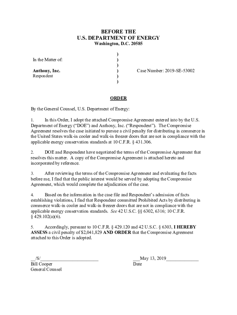 BEFORE THE U.S. DEPARTMENT OF ENERGY Washington, D.C. 20585In the Matter of: Anthony, Inc. Respondent))))))Case Number: 2019SE53002ORDER By the General Counsel, U.S. Department of Energy: In this