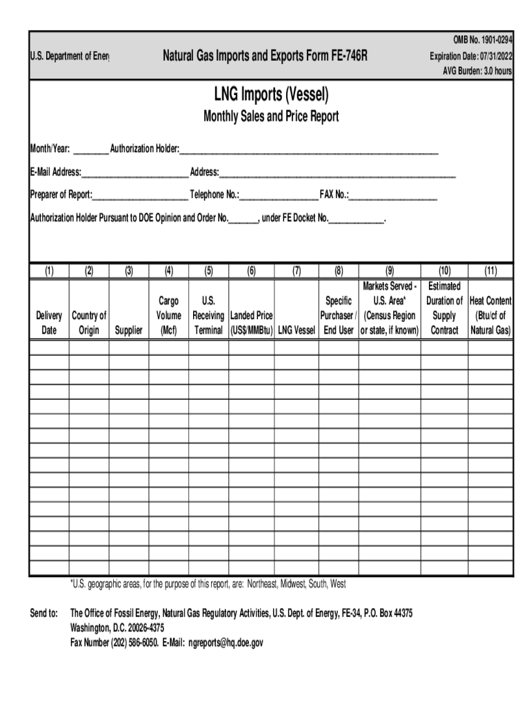 OMB No. 19010294Natural Gas Imports and Exports Form FE746RU. S. Department of EnergyExpiration Date: 07/31/2023 AVG Burden: 3.0 hours LNG Imports (Vessel) Monthly Sales and Price Report Month/Year: