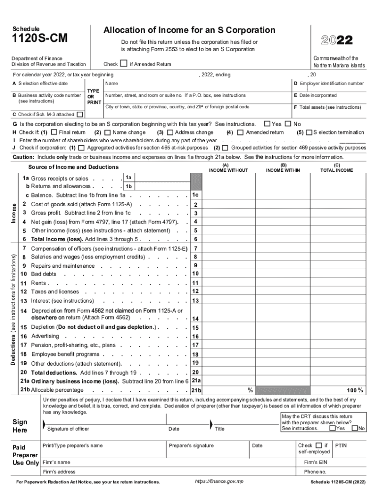 Allocation of Income for an S CorporationSchedule1120SCM2022Do not file this return unless the corporation has filed or is attaching Form 2553 to elect to be an S CorporationDepartment of Finance