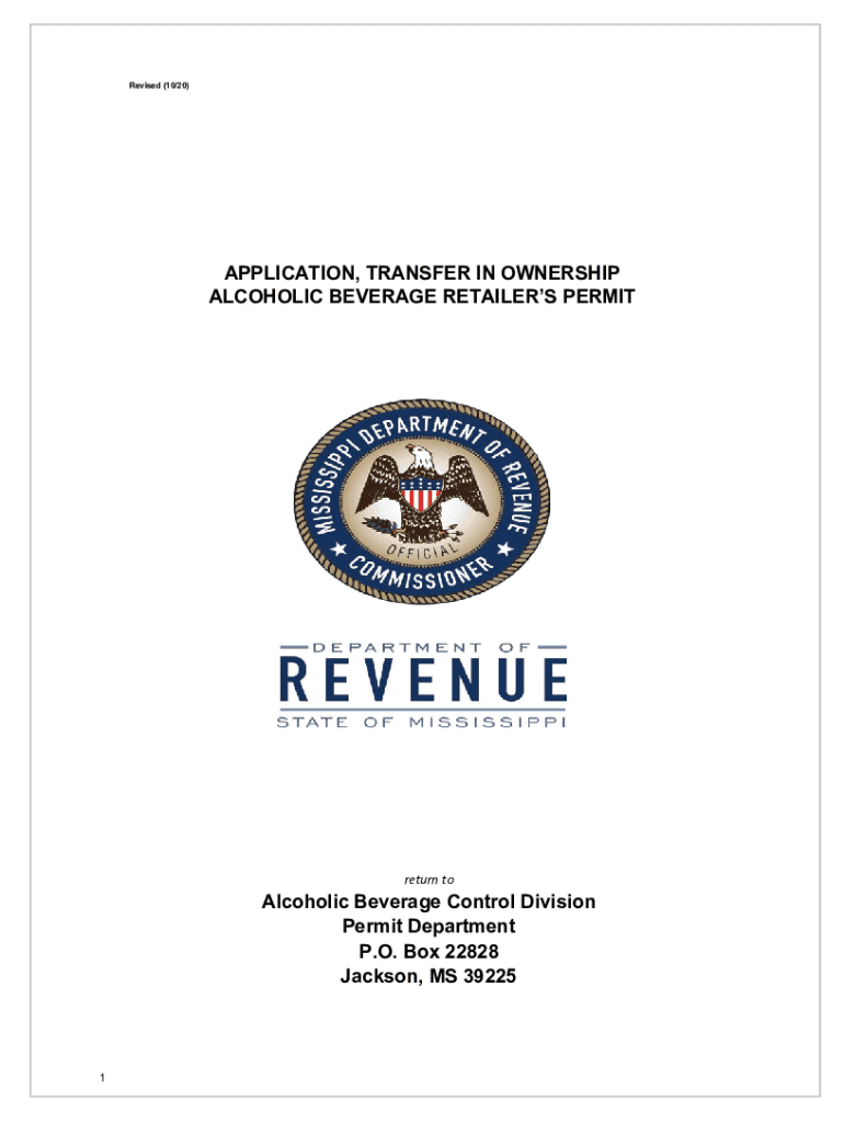 Revised (10/20)APPLICATION, TRANSFER IN OWNERSHIP ALCOHOLIC BEVERAGE RETAILERS PERMIT return alcoholic Beverage Control Division Permit Department P.O. Box 22828 Jackson, MS 392251APPLICATION INSTRUCTIONS