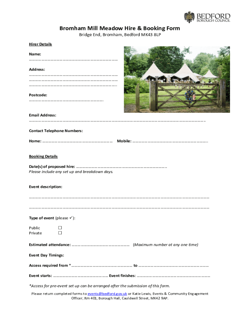 Get the free Bromham Mill Meadow Hire & Booking Form
