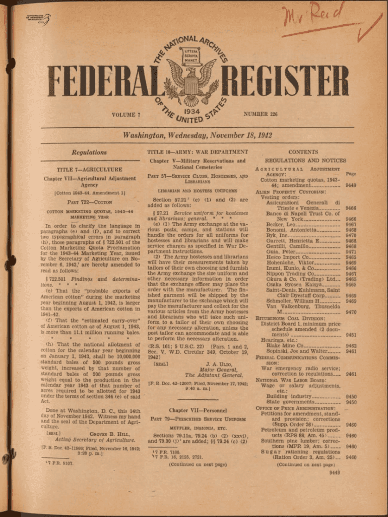 FEDERAL VOLUME 7REGISTER \'9 3 4\' number 226Washington, Wednesday, November 18, 1942, RegulationsTITLE 10ARMY: WAR DEPARTMENTTITLE 7AGRICULTUREChapter Military Reservations and National Cemeteries