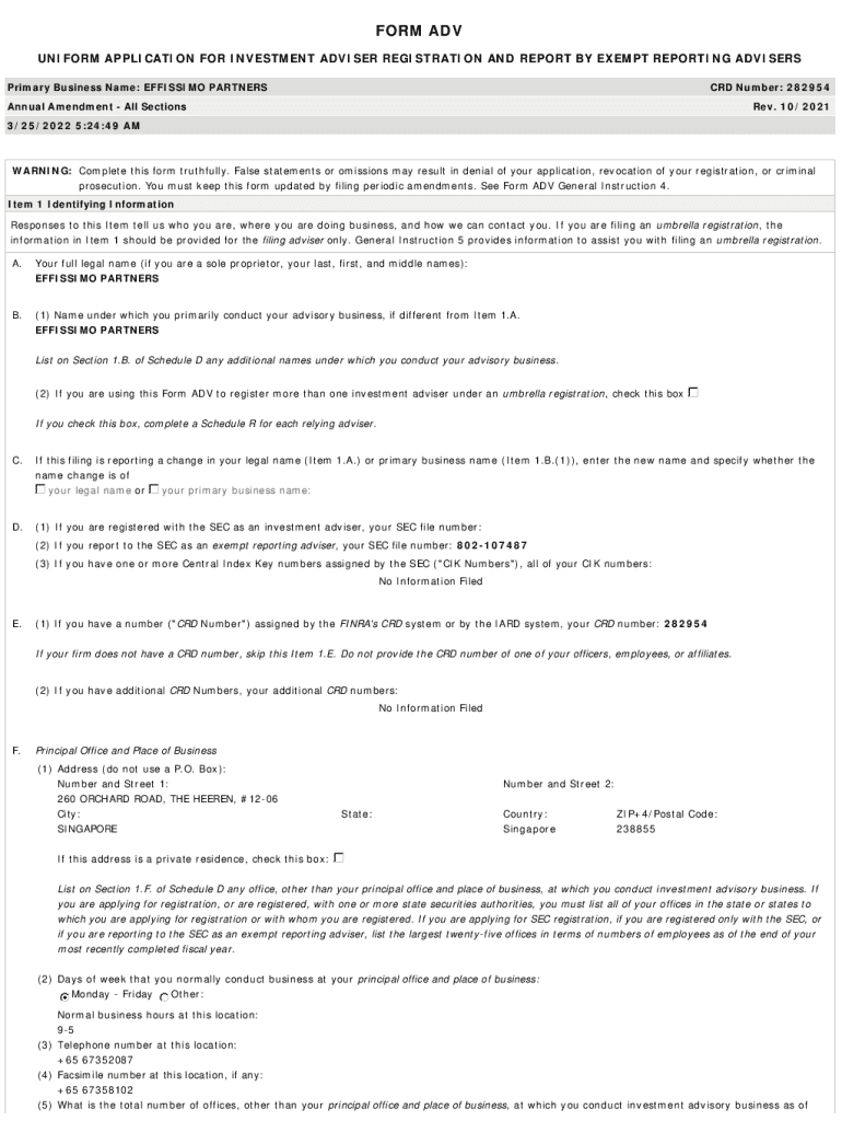 FORM ADV UNIFORM APPLICATION FOR INVESTMENT ADVISER REGISTRATION AND REPORT BY EXEMPT REPORTING ADVISERS Primary Business Name: EFFISSIMO PARTNERS CRD Number: 282954Annual Amendment All Sections Rev.