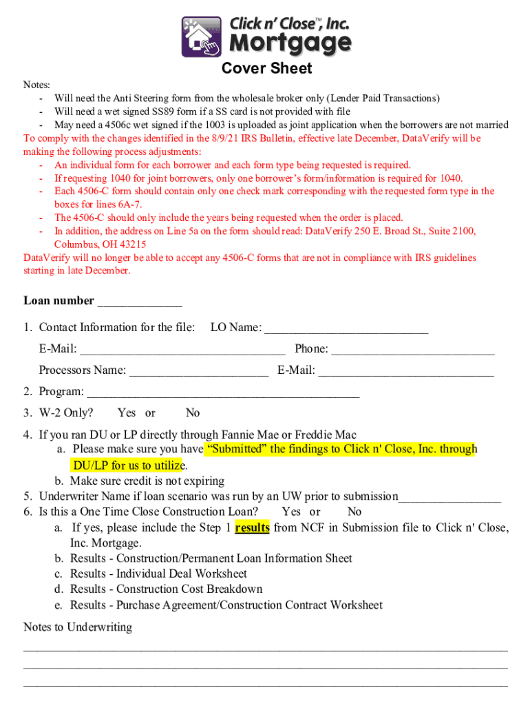 Cover Sheet Notes: Will need the Anti Steering form from the wholesale broker only (Lender Paid Transactions) Will need a wet signed SS89 form if a SS card is not provided with file May needs a 4506c