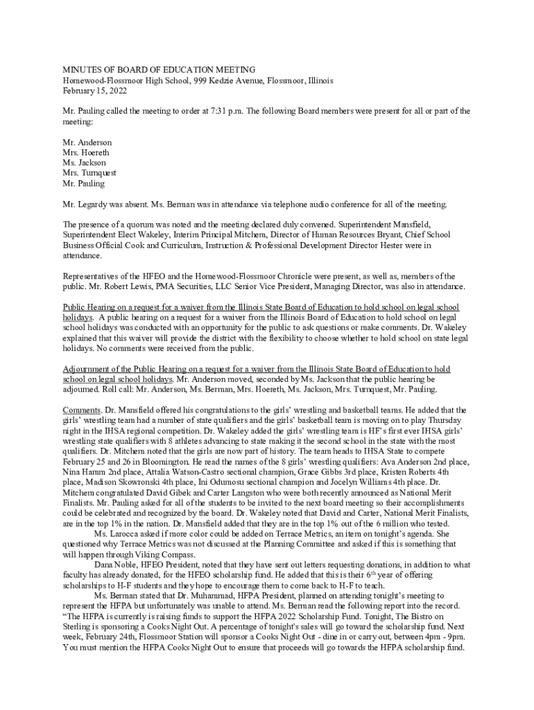 MINUTES OF BOARD OF EDUCATION MEETING HomewoodFlossmoor High School, 999 Kenzie Avenue, Floss moor, Illinois February 15, 2022, Mr. Pauling called the meeting to order at 7:31 p.m. The following Board
