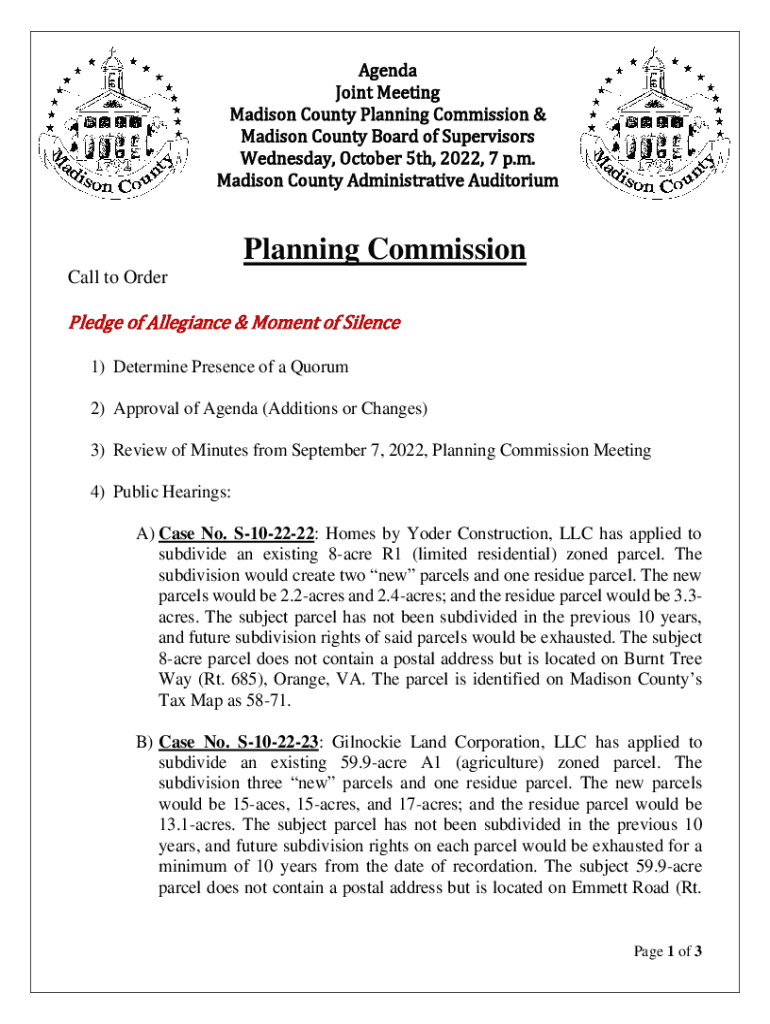 Agenda Joint Meeting Madison County Planning Commission & Madison County Board of Supervisors Wednesday, October 5th, 2022:7 p.m. Madison County Administrative AuditoriumPlanning Commission Call to