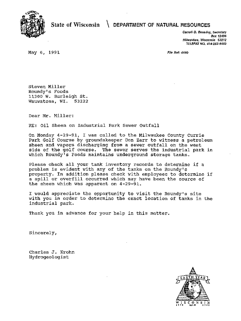 State of WisconsinDEPARTMENT OF NATURAL RESOURCES Carroll D. Beady, Secretary Box 12436 Milwaukee, Wisconsin 53212 TELEFAX NO. 4142638483May 6, 1991File Ref: 4440Steven Miller Round\'s Foods 11300