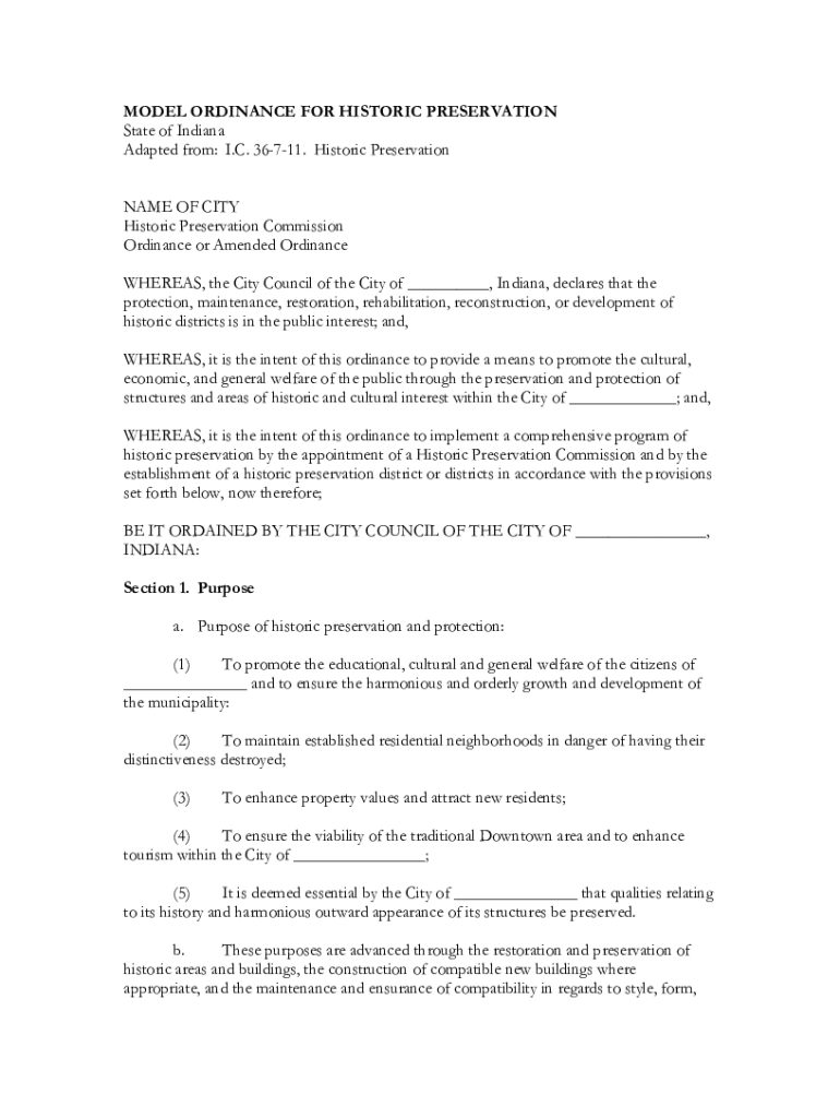 MODEL ORDINANCE FOR HISTORIC PRESERVATION State of Indiana Adapted from: I.C. 36711. Historic Preservation NAME OF CITY Historic Preservation Commission Ordinance or Amended Ordinance WHEREAS, the