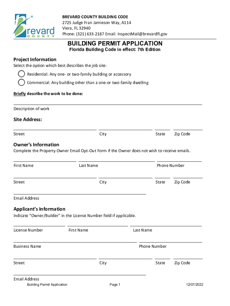 BREVARD COUNTY BUILDING CODE 2725 Judge Fran Jamieson Way, A114 Vera, FL 32940 Phone: (321) 6332187 Email: InspectMail@brevardfl.govBUILDING PERMIT APPLICATION Florida Building Code in effect: 7th
