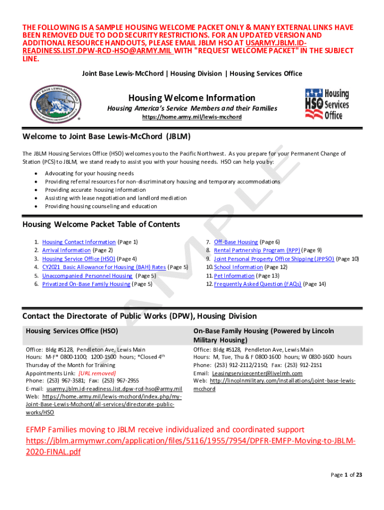 THE FOLLOWING IS A SAMPLE HOUSING WELCOME PACKET ONLY & MANY EXTERNAL LINKS HAVE BEEN REMOVED DUE TO DOD SECURITY RESTRICTIONS. FOR AN UPDATED VERSION AND ADDITIONAL RESOURCE HANDOUTS, PLEASE EMAIL