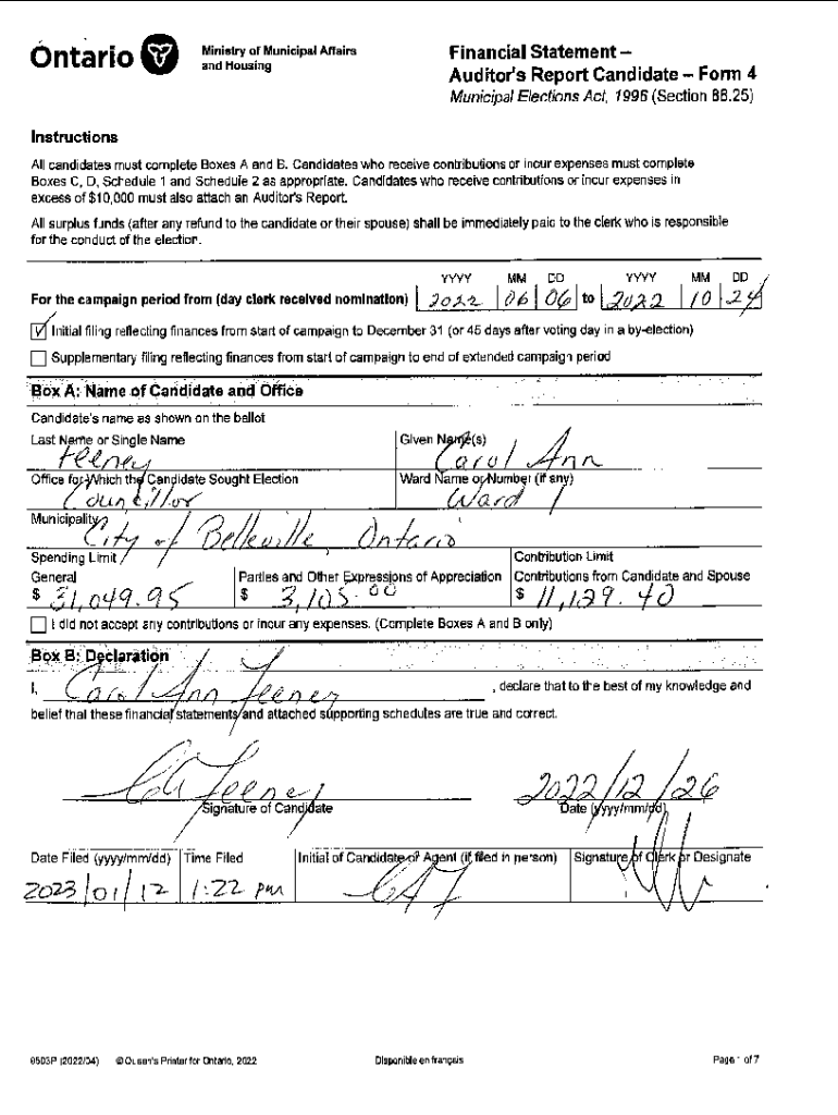 6ntarioi)Ministry of Municipal Affairs and HousingFinancial Statement Auditor\'s Report Candidate Form 4 Municipal Elections Act, 1996 (Section 88.25)Instructions All candidates must complete Boxes