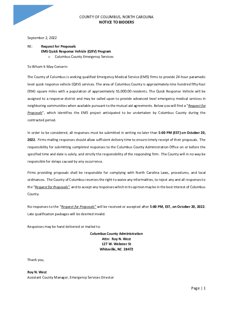 COUNTY OF COLUMBUS, NORTH CAROLINA NOTICE TO BIDDERS September 2, 2022, RE:Request for Proposals EMS Quick Response Vehicle (DRV) Program o Columbus County Emergency Services Whom It May Concern: