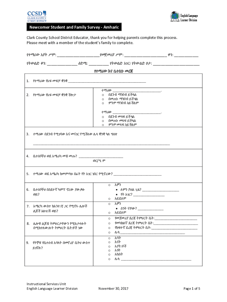 Newcomer Student and Family Survey Amharic Clark County School District Educator, thank you for helping parents complete this process. Please meet with a member of the students' family to complete.