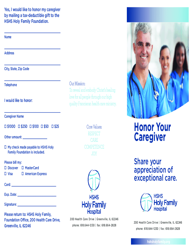 Yes, I would like to honor my caregiver by mailing a tax-deductible gift to the HHS Holy Family Foundation. ___ Name ___ Address ___ City, State, Zip Code ___ Telephone would like to honor:Our Mission: