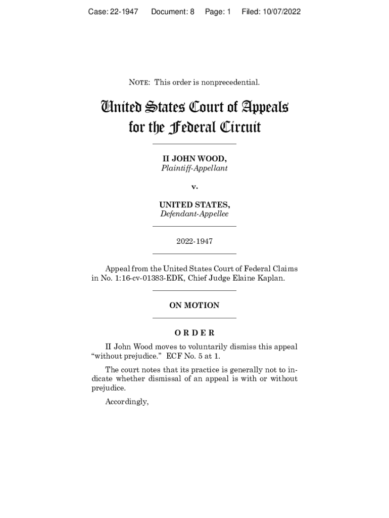 Case: 221947Document: 8Page: 1Filed: 10/07/2022NOTE: This order is nonresidential. United States Court of Appeals for the Federal Circuit ___ II JOHN WOOD, PlaintiffAppellant v. UNITED STATES, DefendantAppellee