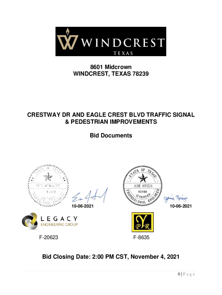 8601 Midcrown WINDIEST, TEXAS 78239CRESTWAY DR AND EAGLE CREST BLVD TRAFFIC SIGNAL & PEDESTRIAN IMPROVEMENTS Bid Documents10062021F2062310062021F8635Bid Closing Date: 2:00 PM CST, November 4, 2021