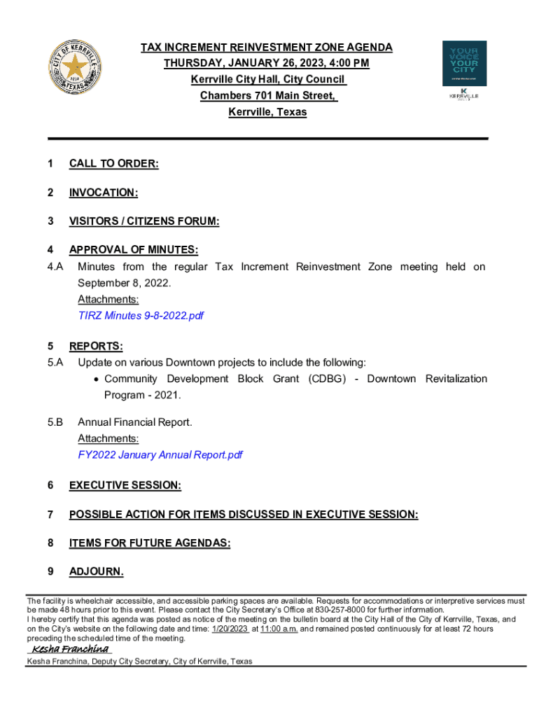 TAX INCREMENT REINVESTMENT ZONE AGENDA THURSDAY, JANUARY 26, 2023, 4:00 PM Kerrville City Hall, City Council Chambers 701 Main Street, Kerrville, Texas1CALL TO ORDER:2INVOCATION:3VISITORS / CITIZENS