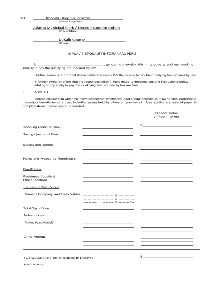 Rhonda Dauphin Johnson TO:(Name of Filing Officer)Atlanta Municipal Clerk / Election Superintendent (Title of Office)___DeKalb County___ (County)AFFIDAVIT TO QUALIFY IN FORM PAUPERS l, __ __ __ __