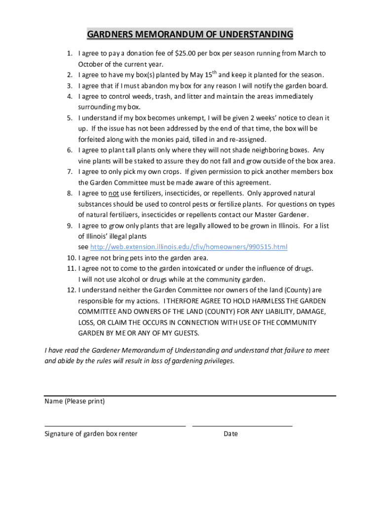 GARDNER MEMORANDUM OF UNDERSTANDING 1. I agree to pay a donation fee of $25.00 per box season running from March to October of the current year. 2. I agree to have my box(s) planted by May 15th and