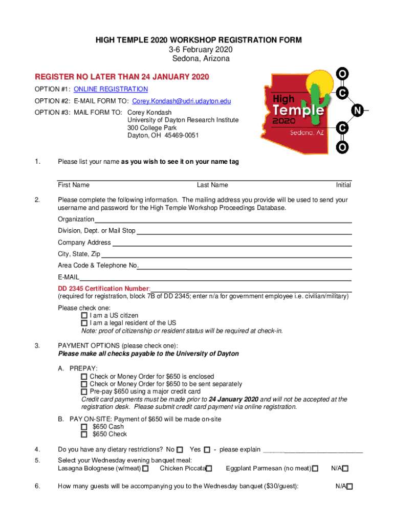 HIGH TEMPLE 2020 WORKSHOP REGISTRATION FORM 36 February 2020 Sedna, Arizona Registers NO LATER THAN 24 JANUARY 2020 OPTION #1: ONLINE REGISTRATION OPTION #2: EMAIL FORM TO: Corey.Kondash@udri.udayton.edu