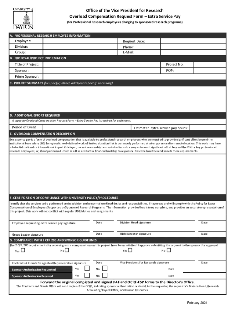 Office of the Vice President for Research Overload Compensation Request Form Extra Service Pay (for Professional Research employees charging to sponsored research programs) A. PROFESSIONAL RESEARCH
