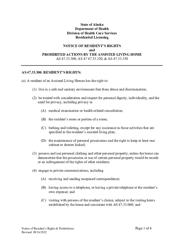 State of Alaska Department of Health Division of Health Care Services Residential Licensing NOTICE OF RESIDENTS RIGHTS and PROHIBITED ACTIONS BY THE ASSISTED LIVING HOME AS 47.33.300, AS 47 47.33.320,