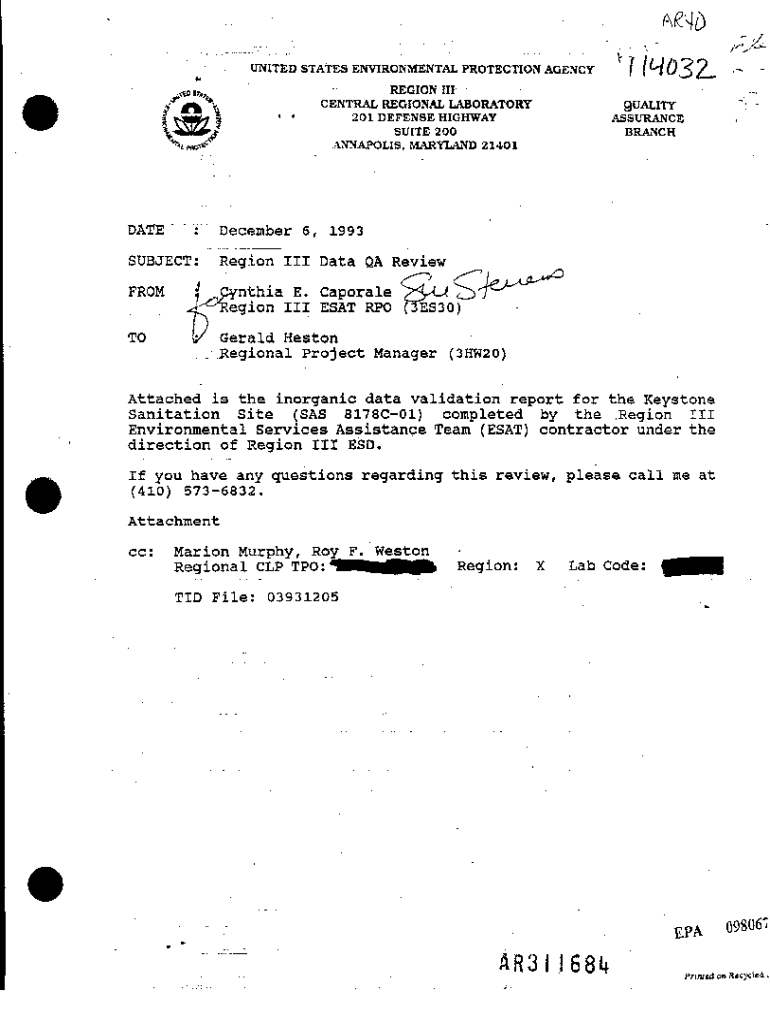 UNITED STATES ENVIRONMENTAL PROTECTION AGENCY\' DATE \” REGION II! CENTRAL REGIONAL LABORATORY 201 DEFENSE HIGHWAY SUITE 200 ANNAPOLIS, MARYLAND 21401QUALITY ASSURANCE BRANCH: December 6, 1993SUBJECT: