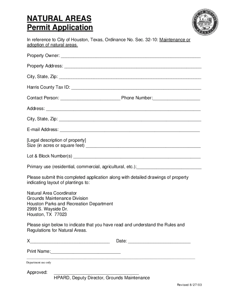 NATURAL AREAS Permit Application In reference to City of Houston, Texas, Ordinance No. Sec. 3210: Maintenance or adoption of natural areas. Property Owner: ___ Property Address: ___ City, State, Zip: