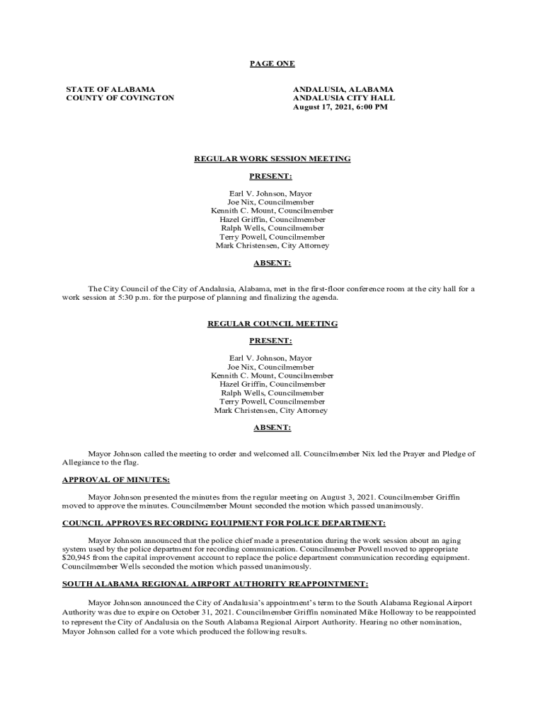 PAGE ONE STATE OF ALABAMA COUNTY OF COVINGTONANDALUSIA, ALABAMA ANDALUSIA CITY HALL August 17, 2021, 6:00 REGULAR WORK SESSION MEETING PRESENT: Earl V. Johnson, Mayor Joe Nix, Council member Kennith