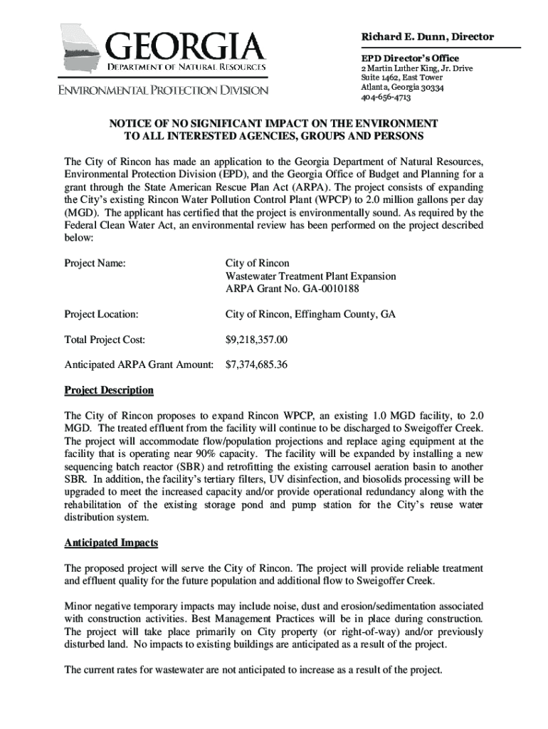 Richard E. Dunn, Director END Directors Office 2 Martin Luther King, Jr. Drive Suite 1462, East Tower Atlanta, Georgia 30334 4046564713NOTICE OF NO SIGNIFICANT IMPACT ON THE ENVIRONMENT TO ALL INTERESTED