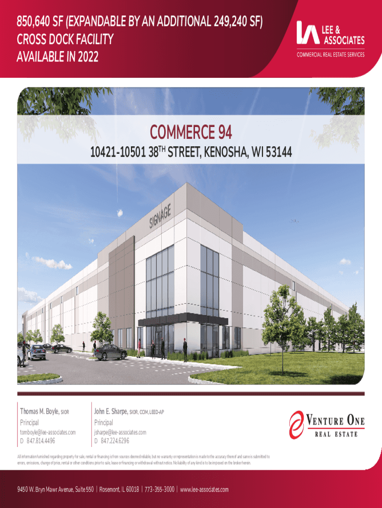 850,640 SF (EXPANDABLE BY AN ADDITIONAL 249,240 SF) CROSS DOCK FACILITY AVAILABLE IN 2022COMMERCE 941042110501 38TH STREET, KENOSHA, WI 53144Thomas M. Boyle, SIR Principal John E. Sharpe, SIR, CCI,
