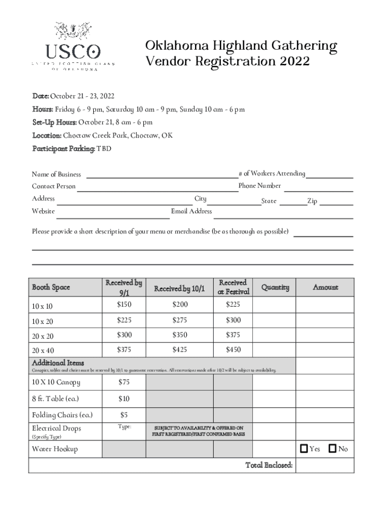 Oklahoma Highland Gathering Vendor Registration 2022 Date: October 21 23, 2022 Hours: Friday 6 9 pm, Saturday 10 am 9 pm, Sunday 10 am 6 pm SetUp Hours: October 21, 8 am 6 pm Location: Choctaw Creek