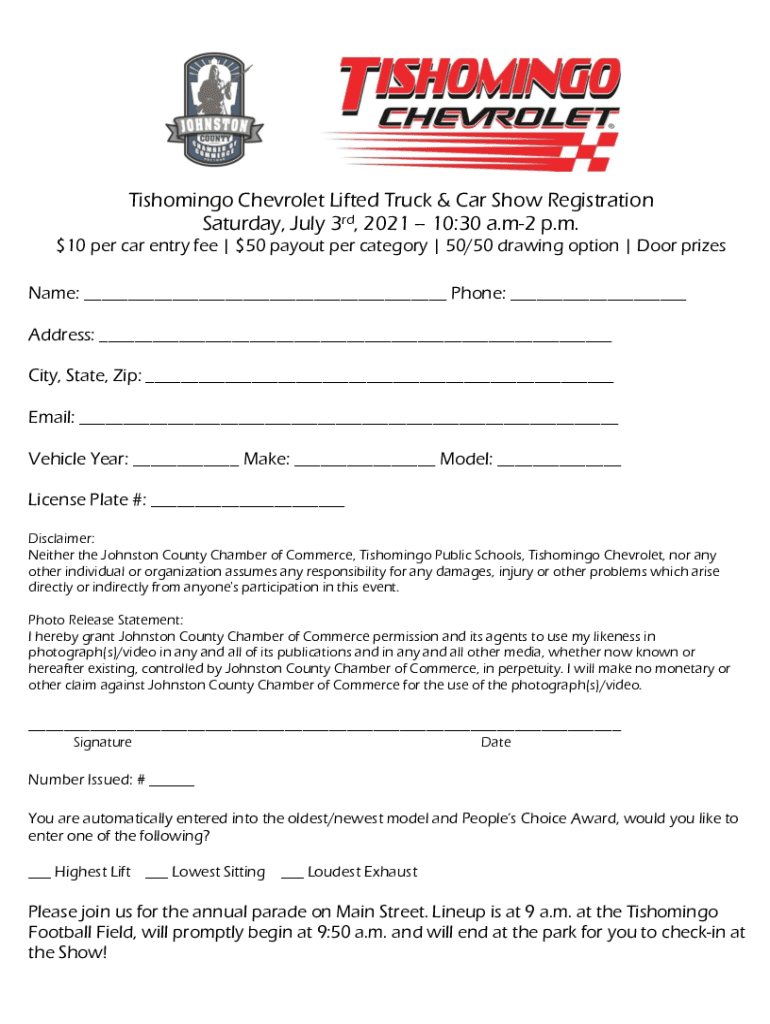 Tishomingo Chevrolet Lifted Truck & Car Show Registration Saturday, July 3rd, 2021 10:30 a.m2 p.m. $10 per car entry fee | $50 payout per category | 50/50 drawing option | Door prizes Name: ___ Phone: