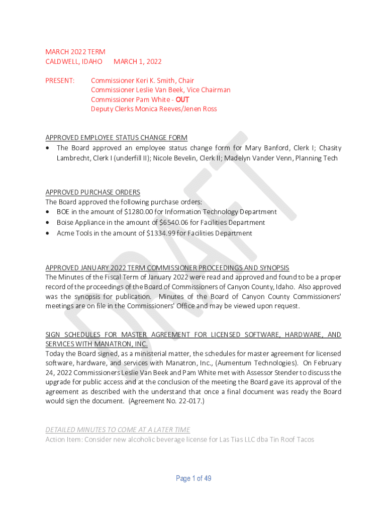 MARCH 2022 TERM CALDWELL, IDAHO PRESENT:MARCH 1, 2022Commissioner Keri K. Smith, Chair Commissioner Leslie Van Been, Vice Chairman Commissioner Pam White OUT Deputy Clerks Monica Reeves/Jensen Disapproved