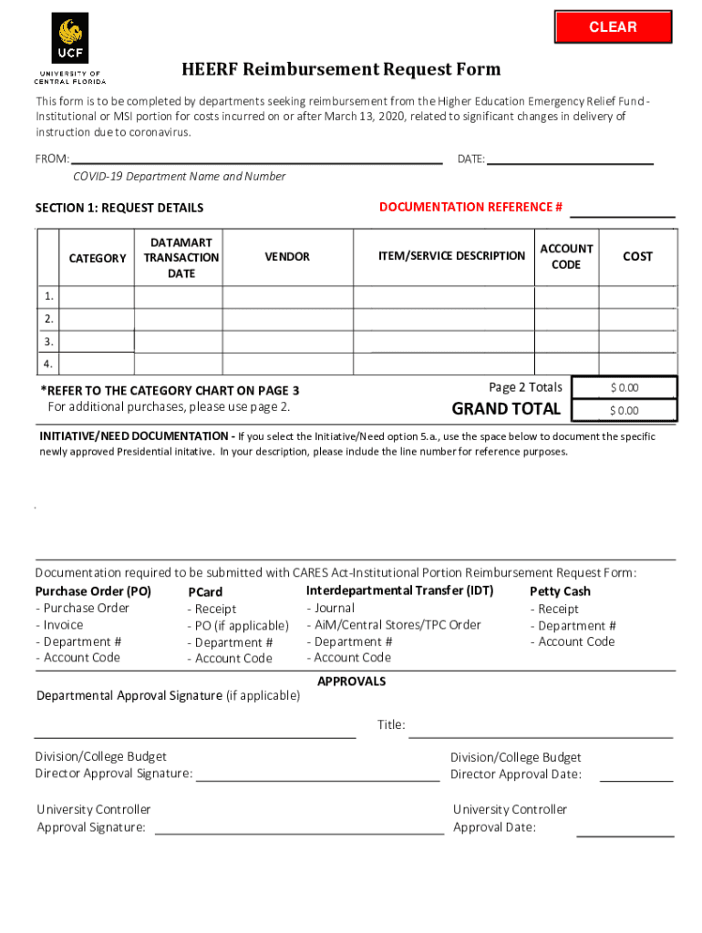 CLEARER Reimbursement Request Form This form is to be completed by departments seeking reimbursement from the Higher Education Emergency Relief Fund Institutional or MSI portion for costs incurred