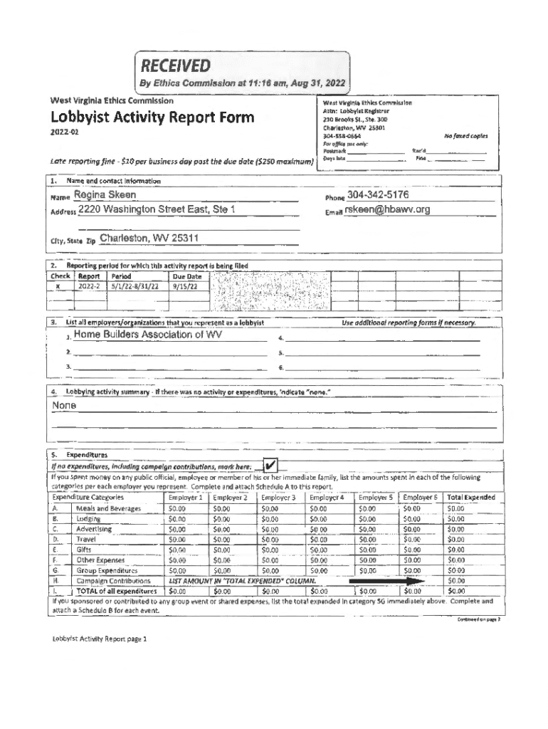 RECEIVED By Ethics Commission at 11:16 am, Aug 31, 2022 West Virginia Ethics Commission West Virginia Ethics Commission Attn: Lobbyist Registrar 210 Brooks St., Ste. 300 Charleston, WV 25301 3045580664Lobbyist