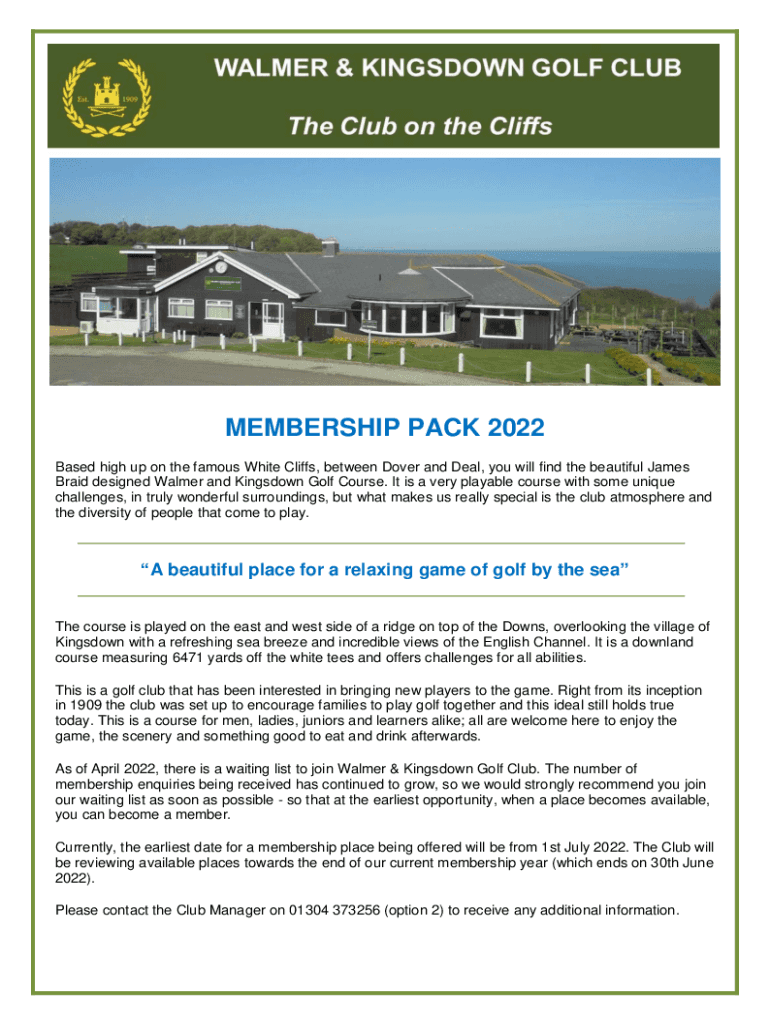 MEMBERSHIP PACK 2022 Based high up on the famous White Cliffs, between Dover and Deal, you will find the beautiful James Braid designed Walker and Kingstown Golf Course. It is a very playable course