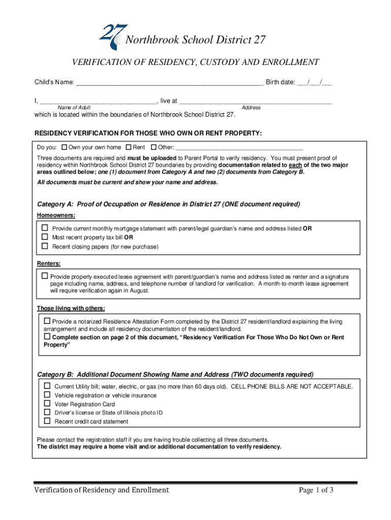 Northbrook School District 27 VERIFICATION OF RESIDENCY, CUSTODY AND ENROLLMENT Child's Name: ___ Birth date: ___/___/___ I, ___, live at ___ Name of AdultAddresswhich is located within the boundaries